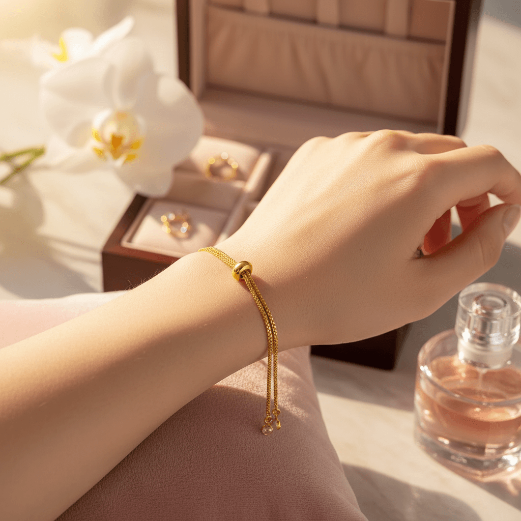 Esta pulseira folheada a ouro 18K combina delicadeza e estilo, com design ajustável que se adapta perfeitamente ao seu pulso. Ideal para quem busca um acessório sofisticado e cheio de significado.
