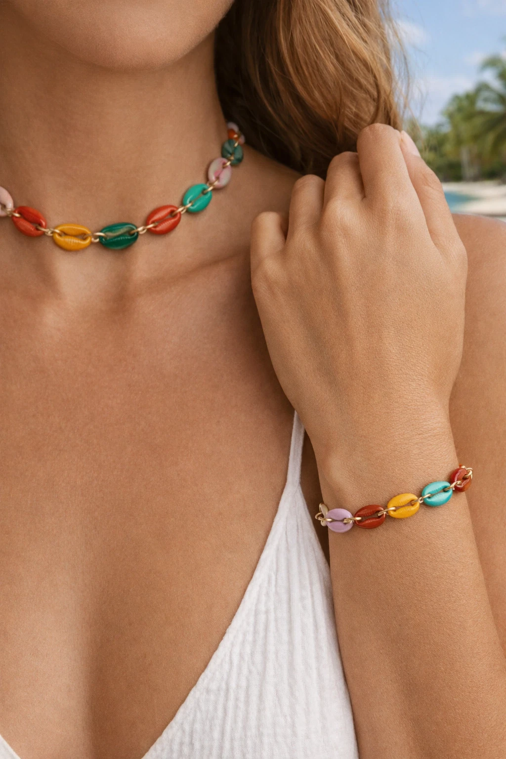 Kit Colar e Pulseira Miçanga Coloridos Bijoux com elos entrelaçados—joia moderna e elegante para qualquer ocasião. Elos ovalados em tom rosé com acabamento polido proporcionam brilho sutil e acabamento resistente. Leve, confortável e fácil de combinar com looks neutros ou coloridos. Ideal para completar produções do dia a dia, passeio, confraternizações ou presente especial.