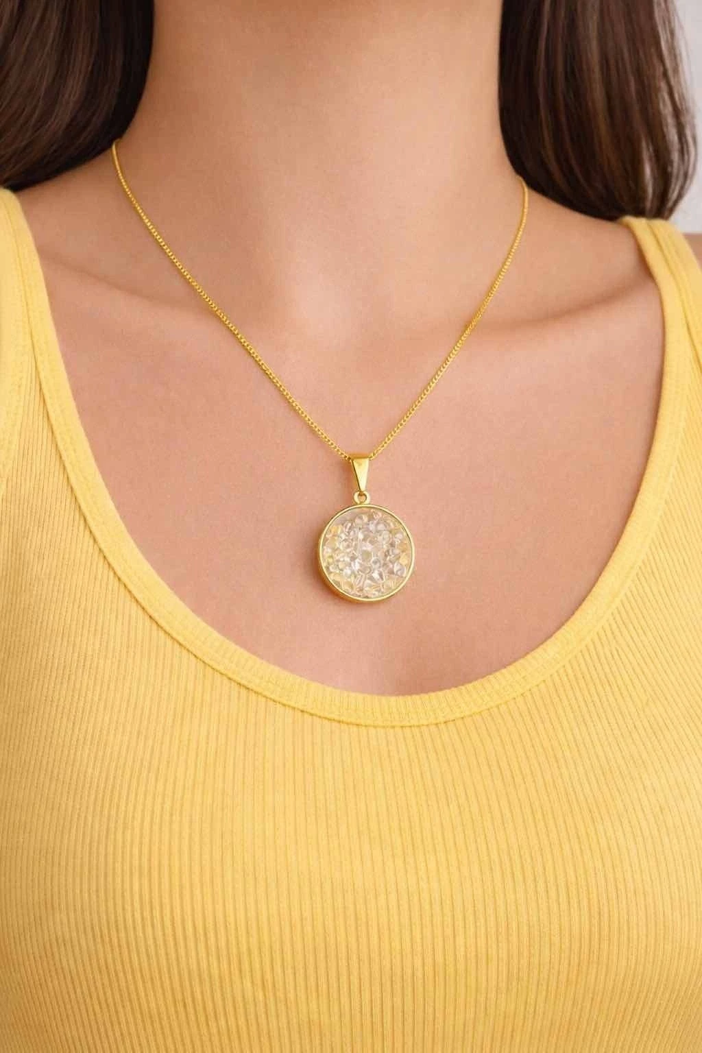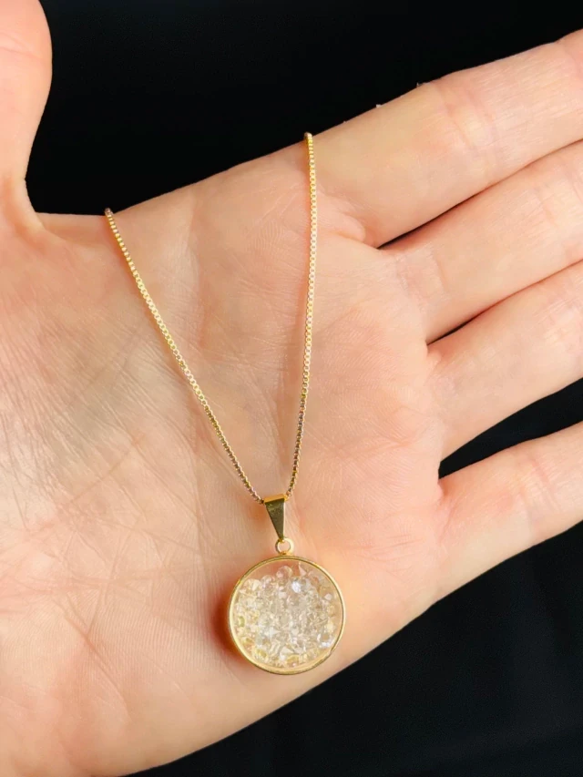 Colar dourado com pingente circular, pendente com cristal translúcido que reflete a luz em nuances cintilantes. Corrente delicada, acabamento polido e design minimalista que valoriza o colo em qualquer ocasião. Leve, resistente e fácil de combinar com outras joias. Perfeito para uso diário, looks casuais ou para presentear quem você ama.