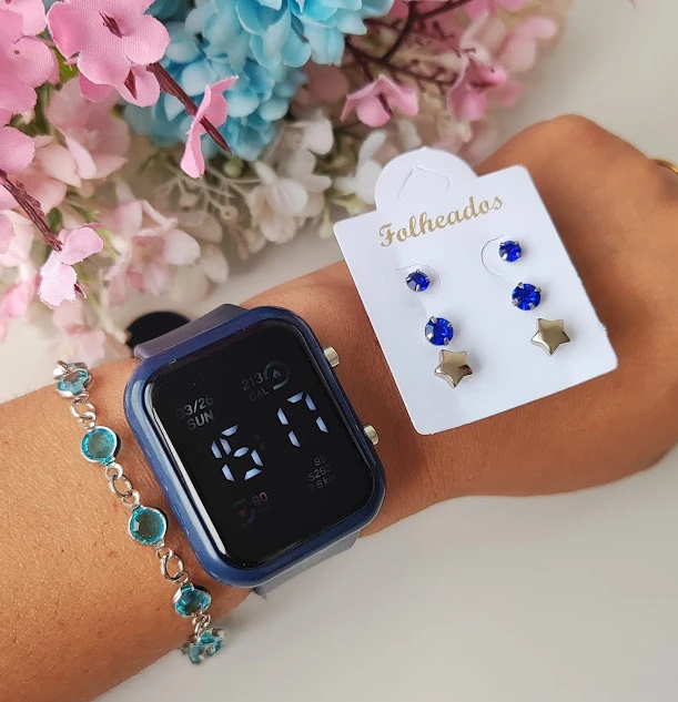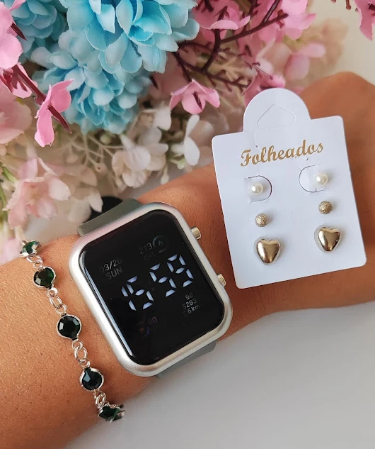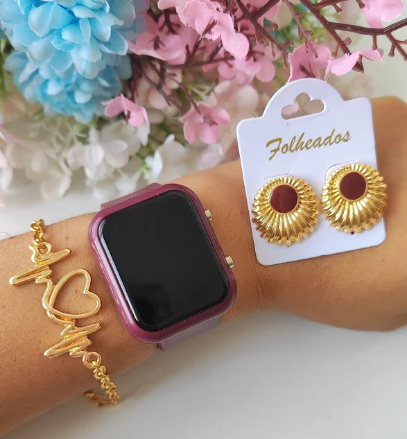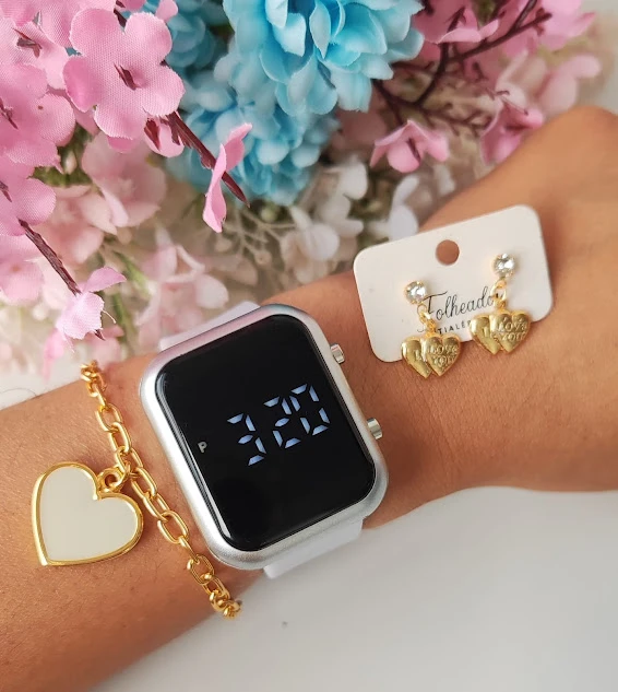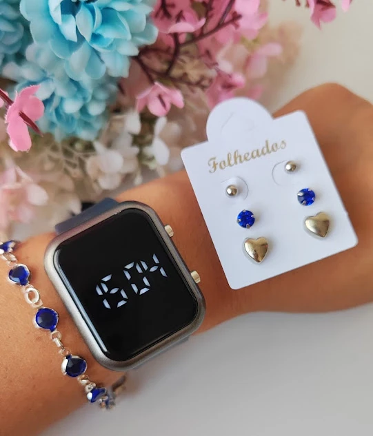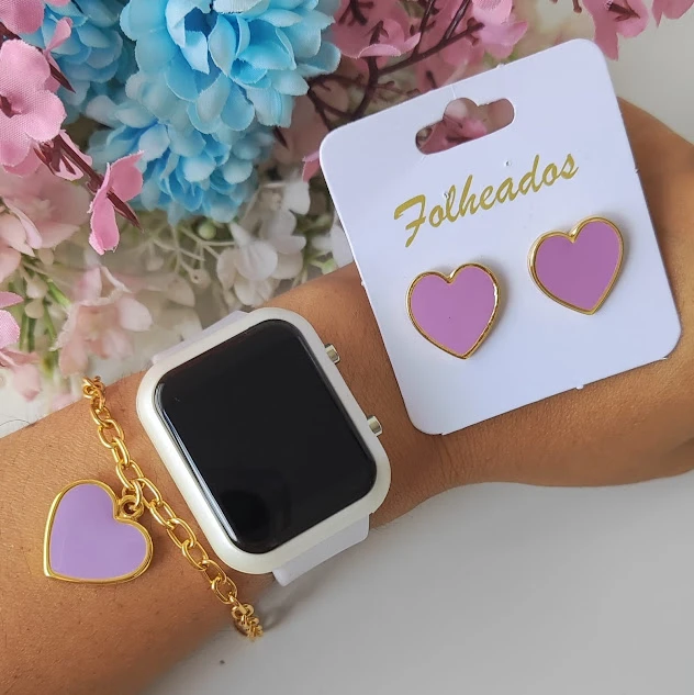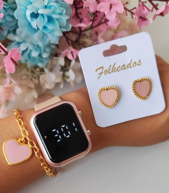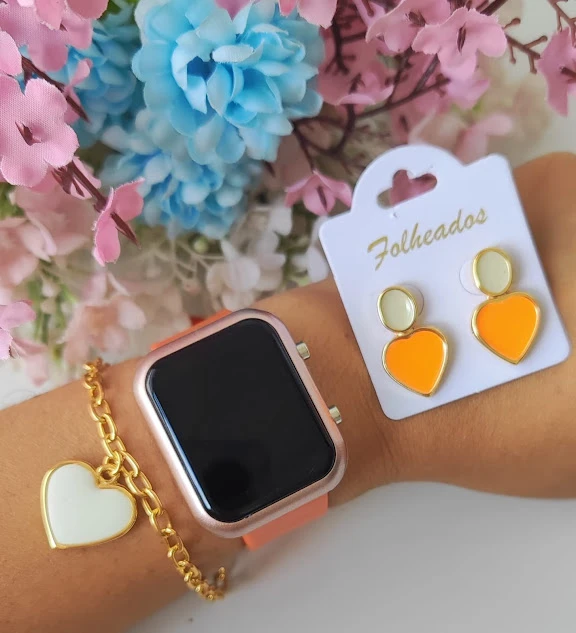Conjunto folheado com relógio moderno e brincos delicados. Relógio com mostrador preto e pulseira de silicone, design elegante para o dia a dia. Brincos incluem par de studs com pedrinhas e um charm em formato de coração, tudo com acabamento durável que brilha discretamente. Ótimo para complementar looks casuais, officewear ou ocasiões especiais com estilo contemporâneo.
