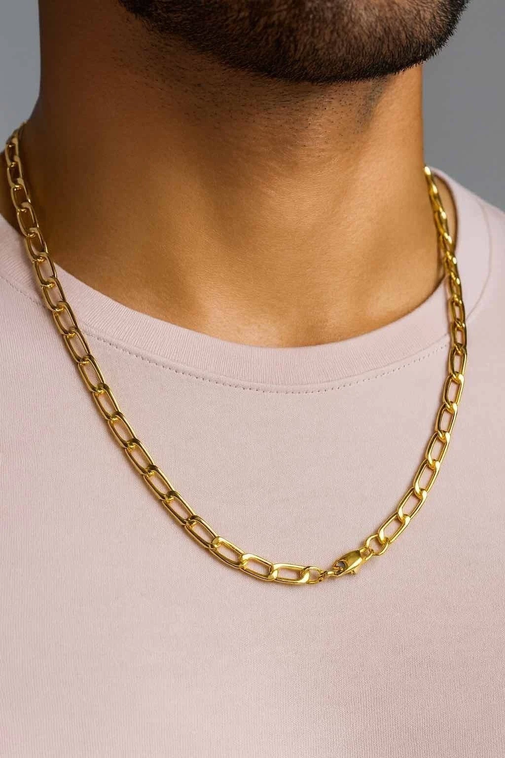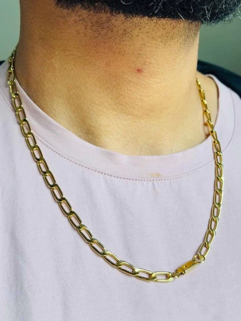 Colar corrente masculina em banho dourado com elos largos e acabamento polido que brilha a cada movimento. Leve, resistente e com fechamento seguro, perfeito para uso diário ou ocasiões especiais.
