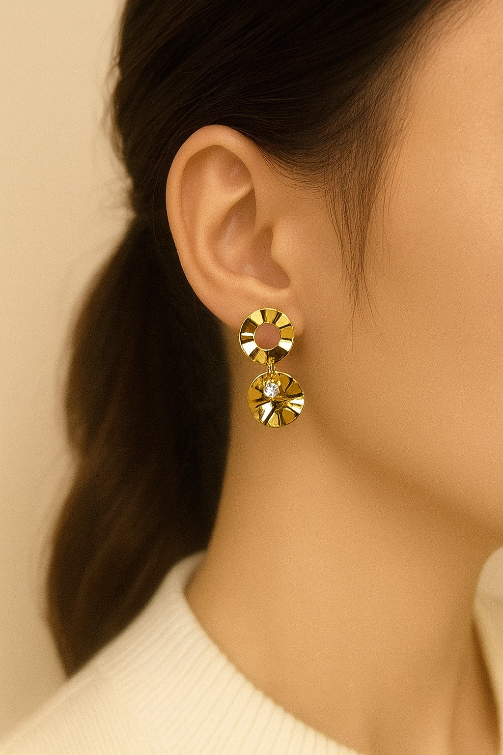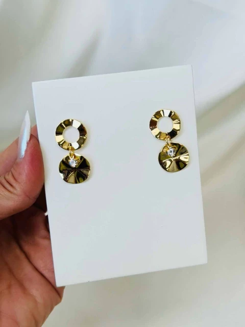 Brincos dourados com design circular duplo, acabamento texturizado que captura a luz com sofisticação. Banho de ouro suave, peso equilibrado e fechamento seguro, perfeitos para uso diário ou eventos. O entrelaçamento entre os círculos cria um visual moderno e elegante, com brilho discreto de zircônia no centro para um toque de brilho sem exagero. Versáteis e clássicos, combinam com tudo.