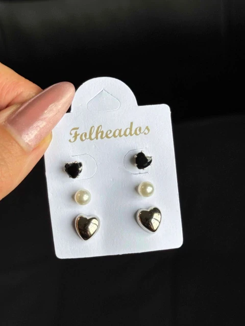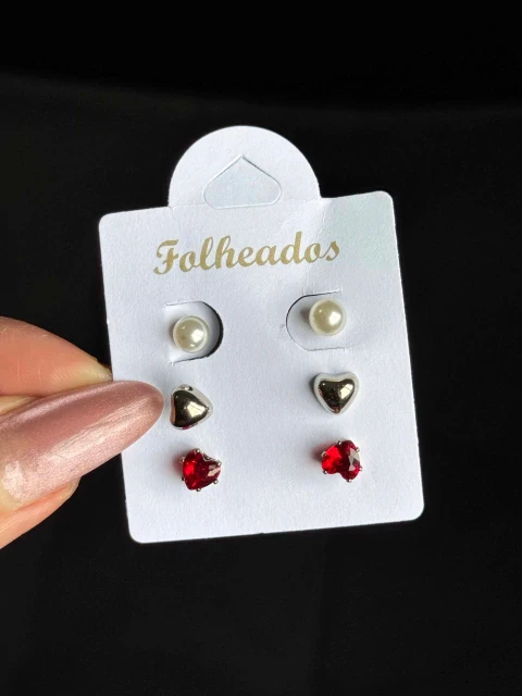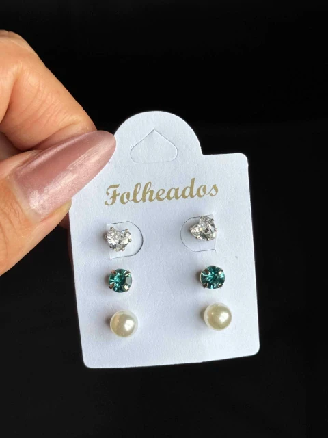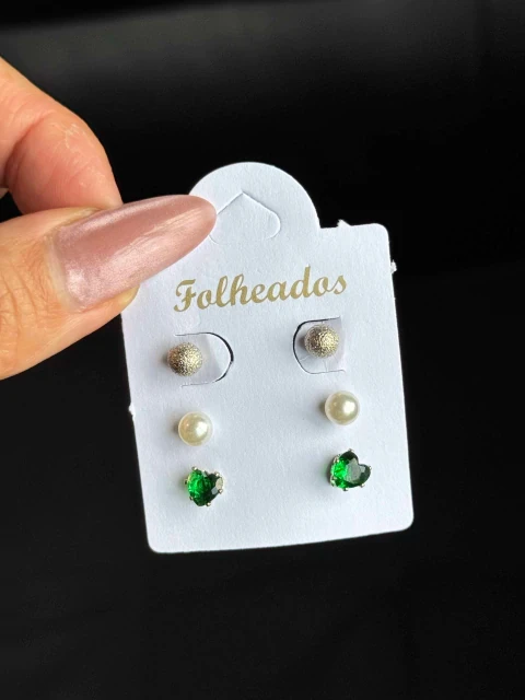 Conjunto de brincos folheados com três pares: bolinhas de brilho, pérolas clássicas e delicados corações verdes. Banho de ouro com acabamento polido, leve, resistente e de toque suave na pele. Perfeito para uso diário, festas ou presentear alguém que gosta de acessórios versáteis e com cara de premium. Combine com várias produções e destaque seu visual com sofisticação discreta.