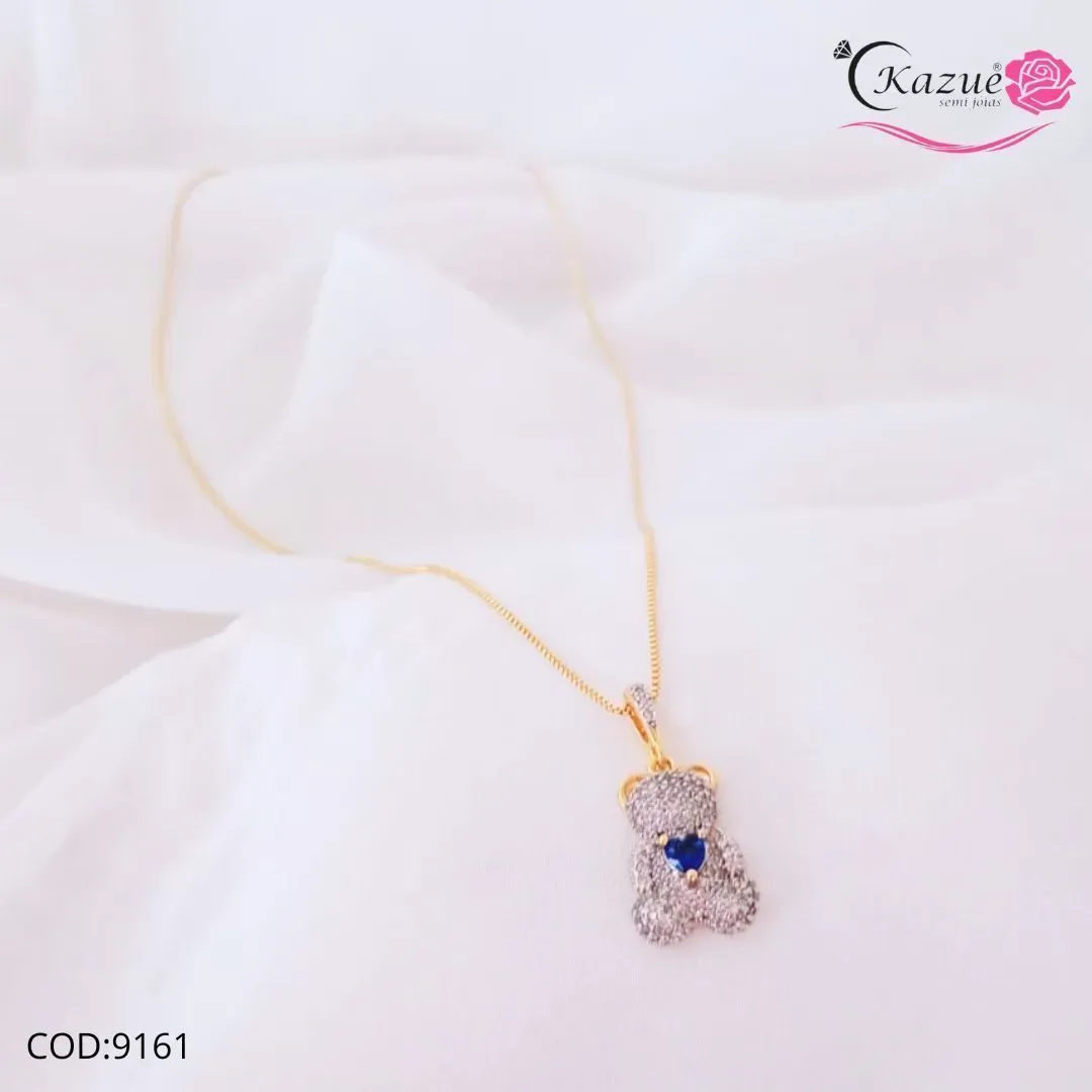 COLAR URSO CRISTAL AZUL — Colar delicado com pingente em formato de ursinho cravejado, com pedra azul central que adiciona brilho sofisticado. Corrente dourada de acabamento brilhante e fecho seguro, pensado para uso cotidiano e ocasiões especiais. Versátil para looks femininos, eleva o estilo de qualquer produção e é um presente inesquecível para quem gosta de delicadeza com personalidade.