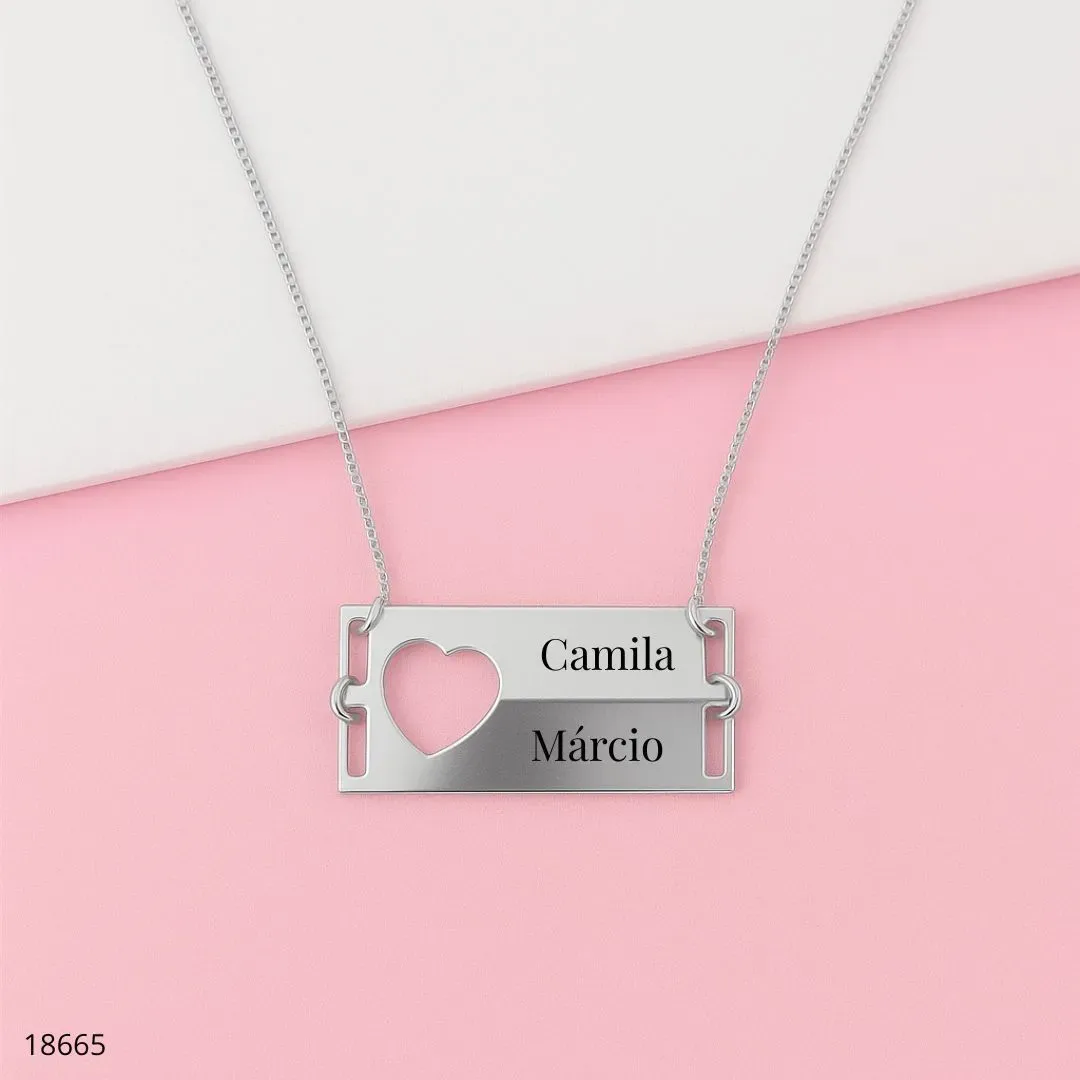 COLAR PENDENTE DUPLO PERSONALIZADO em banho dourado, com coração recortado e duas gravações de nomes. A peça perfeita para registrar alguém especial: personalize com seus nomes para um toque único e inesquecível. Corrente delicada, acabamento polido e resistência ideal para uso diário. Ideal para presentear em aniversários, datas marcantes ou para quem você ama.