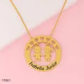 Colar personalizado com nomes: pendente circular em banho dourado com dois charms de crianças e corações ao redor. Gravado com o nome escolhido, acabamento polido e brilho duradouro. Perfeito para presentear mamães, avós ou filhas, em ocasiões especiais ou para o dia a dia. Corrente ajustável para acompanhar qualquer estilo com conforto e sofisticação.