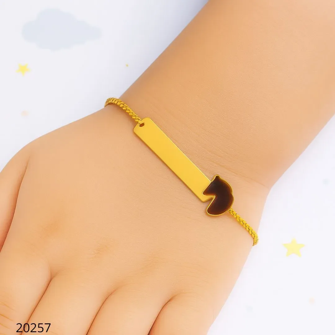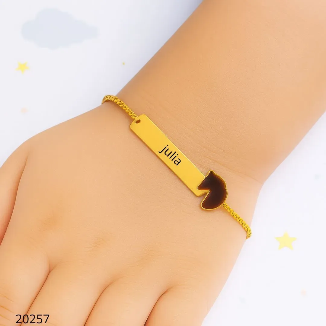 Pulseira dourada com placa lisa e pingente em formato de cabeça de cavalo. Acabamento em banho dourado com brilho duradouro, corrente delicada e fecho tipo lobster para uso diário com conforto e segurança. Ideal para quem ama estilo minimalista ou como presente elegante para fãs de cavalos.