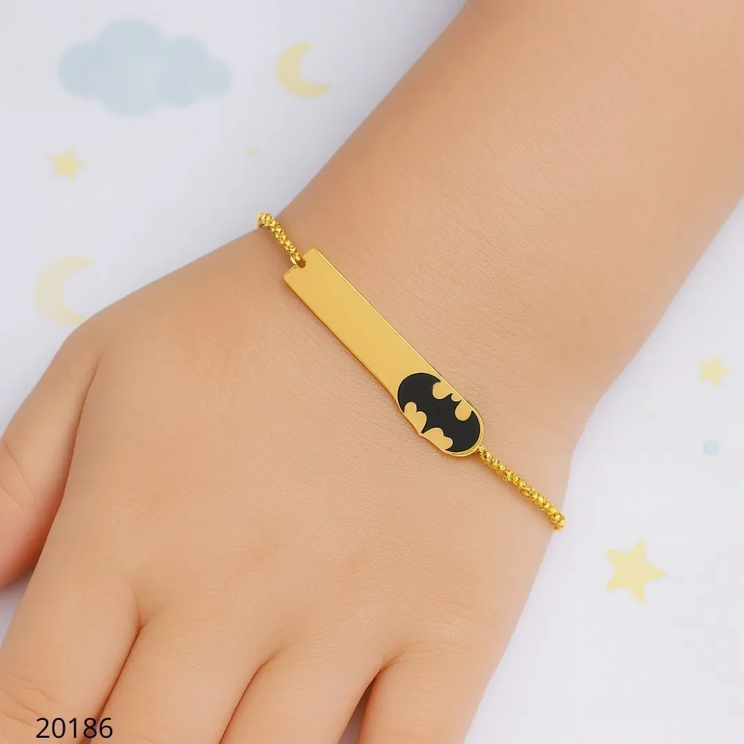 PULSEIRA BANHADA OURO COM PLACA RETANGULAR E LOGO BATMAN. Peça fashion com brilho suave, ideal para usar no dia a dia ou montar looks casuais com personalidade. Corrente delicada, acabamento polido e fecho seguro. Banho de ouro resistente para durar, leve e confortável no pulso. Presente perfeito para fãs de heróis que buscam estilo discreto.