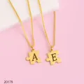 Conjunto de dois colares com pingentes em formato puzzle, cada peça trazendo a letra A ou E em acabamento dourado. Correntes finas, mas resistentes, com brilho suave para usar no dia a dia ou em looks de festa. Peças que combinam entre si, ideais para presentear alguém especial ou para casais que gostam de estilo coordenado. Leves, duráveis e fáceis de combinar com outras joias.