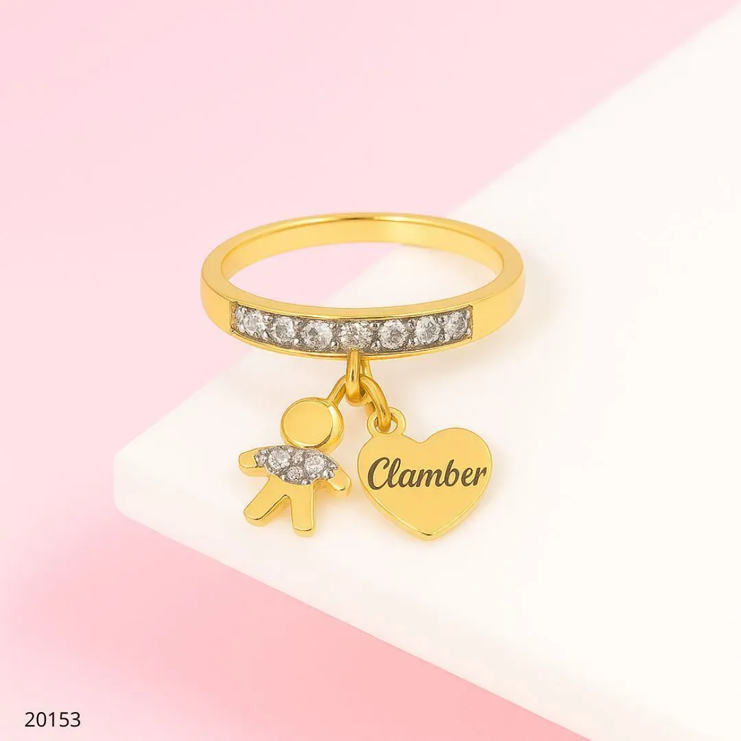Anel dourado com faixa polida e zircônias que brilham. Três pingentes delicados trazem personalidade: coração com o nome gravado, estrela e triângulo. Banho dourado resistente, acabamento elegante e estilo moderno para uso diário ou ocasiões especiais. Perfeito como presente personalizado para quem busca um toque único no look.