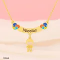 Colar infantil com placa curva gravada com o nome escolhido, em metal banhado a ouro e corrente delicada. Nas extremidades, pingentes de coração em puzzle, coloridos, com acabamento polido que brilha em qualquer ocasião. O nome pode ser personalizado, tornando esta peça única para presentear seu filho, filha, neto ou neta. Ideal para aniversário, batizado ou lembrança especial.