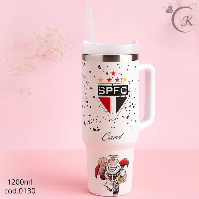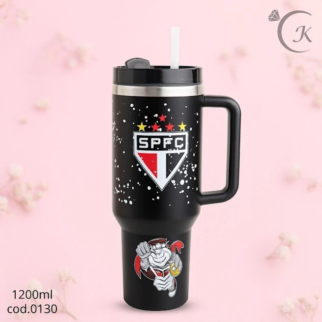 GARRAFA TERMICA 1200ML SPFC com tampa e canudo. Mantém bebidas quentes por horas e frias por muito tempo graças ao isolamento de dupla parede que evita condensação. Corpo em aço inox de alta durabilidade com acabamento suave e logo SPFC. Tampa com vedação firme e bocal amplo para facilitar o uso com o canudo. Ideal para torcedores, treinos, trabalho e viagens — resistente, prática e com estilo de torcer pelo SPFC.