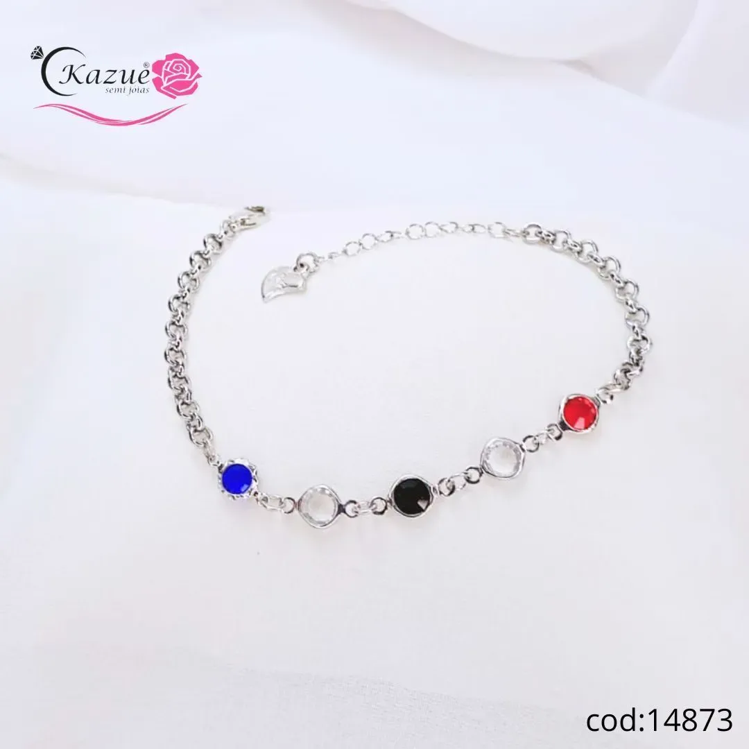 Pulseira colorida com pedras redondas em aro dourado, confeccionada em metal com acabamento folheado a ouro. Sequência de pedras nas cores preto, rosa, transparente, vermelho e verde cria um visual moderno e elegante para qualquer look. Extensor de corrente para ajuste perfeito e fecho seguro. Leve, resistente e ideal para uso diário, ocasiões especiais ou presentear alguém com estilo.