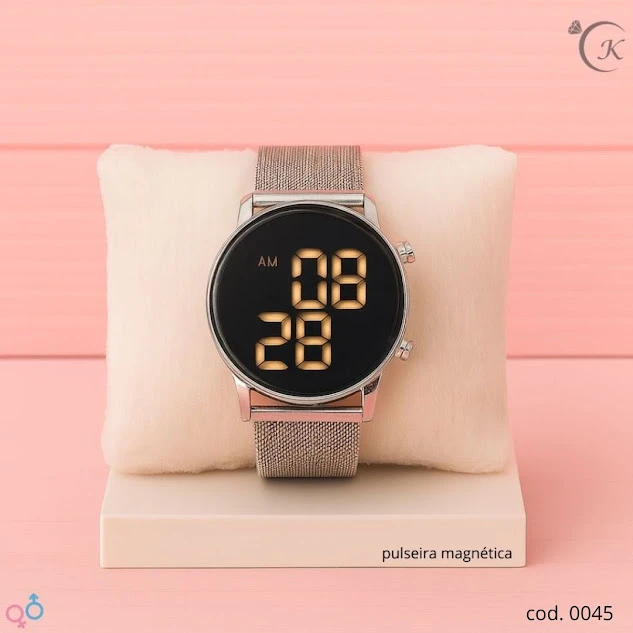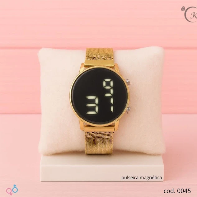 Relógio Magnético Dourado com pulseira mesh e visor digital preto. A pulseira magnética oferece ajuste rápido, sem fivelas, garantindo conforto o dia inteiro. Design moderno e versátil, perfeito para looks casuais ou formais. Leve, resistente e com acabamento de qualidade, é o acessório ideal para quem busca estilo e praticidade.