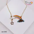 Colar pendente com arco-íris colorido, nuvem e estrela, acabamento em banho dourado suave e corrente delicada. Peça charmosa para meninas, combina com diferentes estilos e é ideal para looks casuais ou festivos. Leve, resistente e confortável de usar o dia todo. Ótimo como presentinho de aniversário ou lembrança especial.