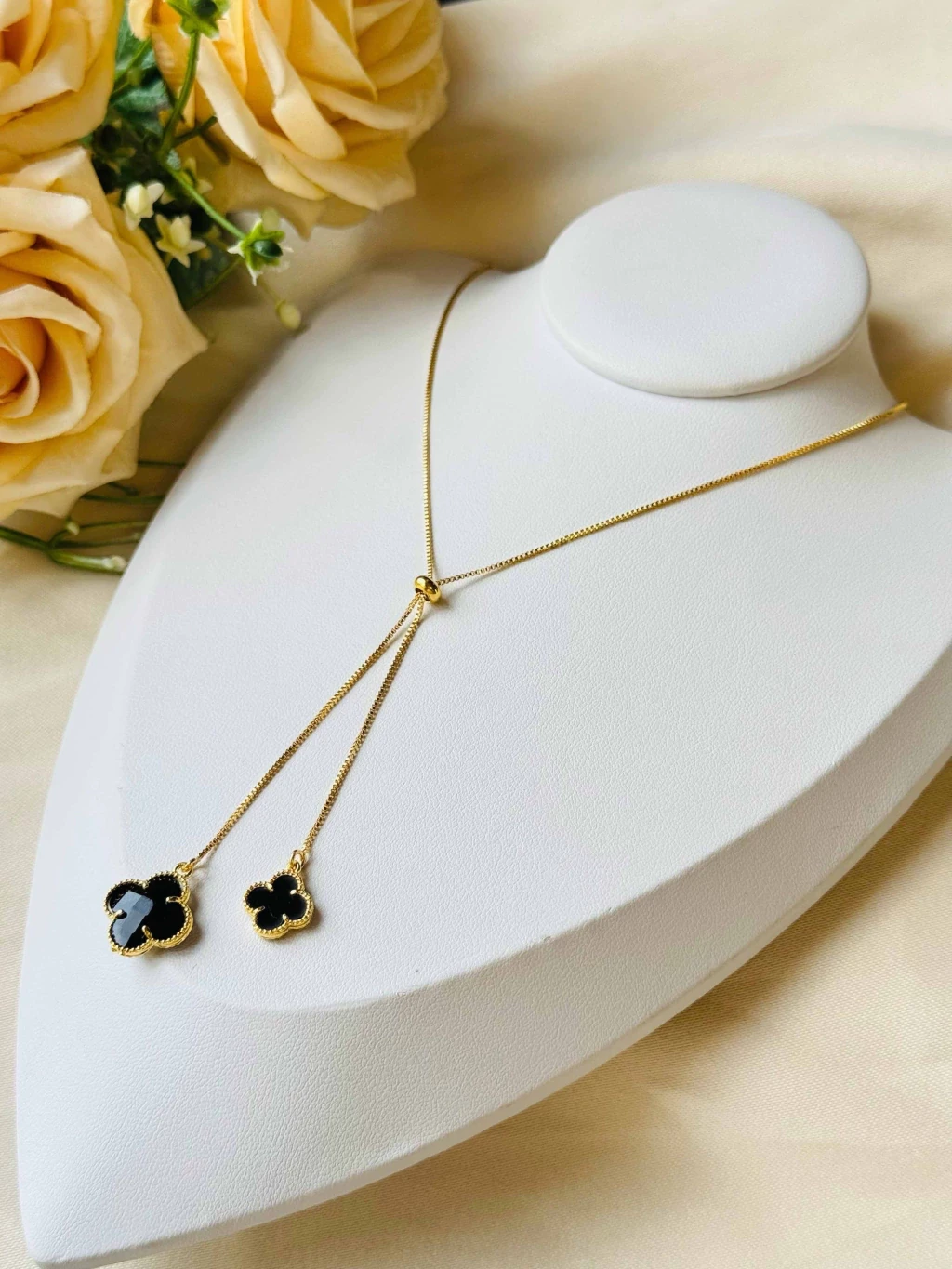 Colar longo em banho de ouro com dois pingentes em formato de flor, design delicado e elegante para qualquer ocasião. A corrente ajustável oferece conforto e versatilidade, perfeito para o dia a dia ou eventos especiais. Um acessório sofisticado que valoriza o colo e combina com looks casuais ou nobres. Ideal como presente para quem gosta de peças atemporais e cheias de estilo.