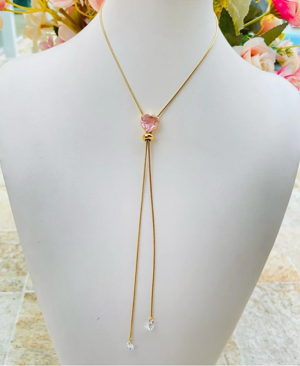 Colar longo em banho de ouro com detalhe em Y, apresentando um pingente em formato de coração rosa facetado na altura do colo e duas pontas que caem com pequenos pingentes de zircônias transparentes.