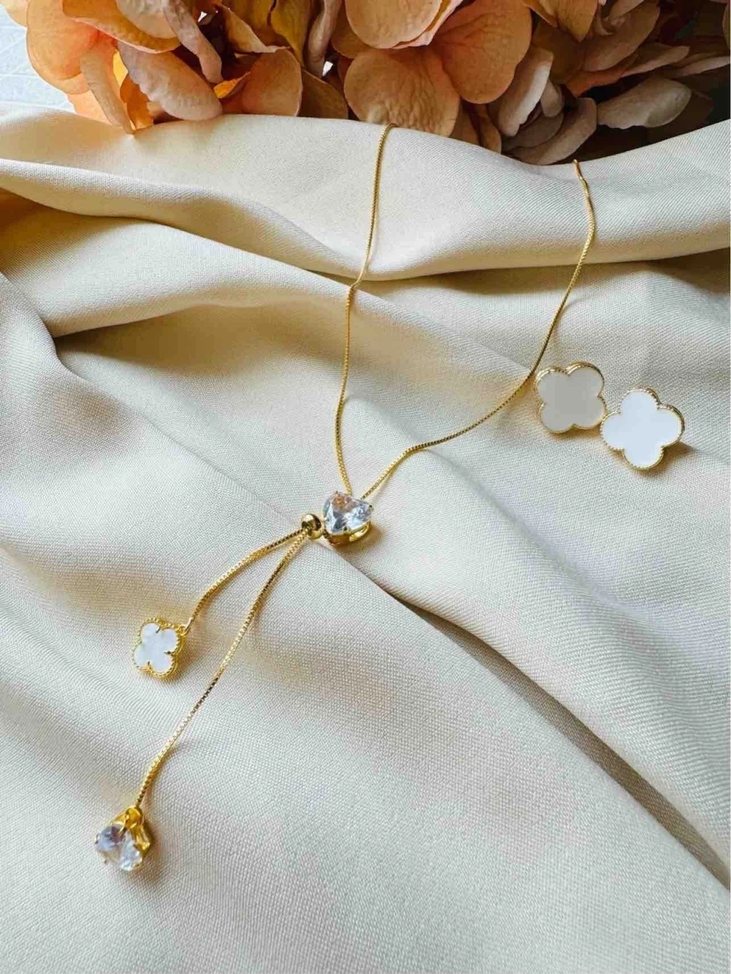 Conjunto delicado em banho de ouro 18K, composto por colar com pingente central em formato de flor quattrofoil e brincos combinando em branco esmalte com contorno dourado. Brilho suave, acabamento refinado e fecho seguro garantem conforto o dia inteiro. Versátil para o dia a dia, eventos ou presenteie alguém especial com estilo e elegância.