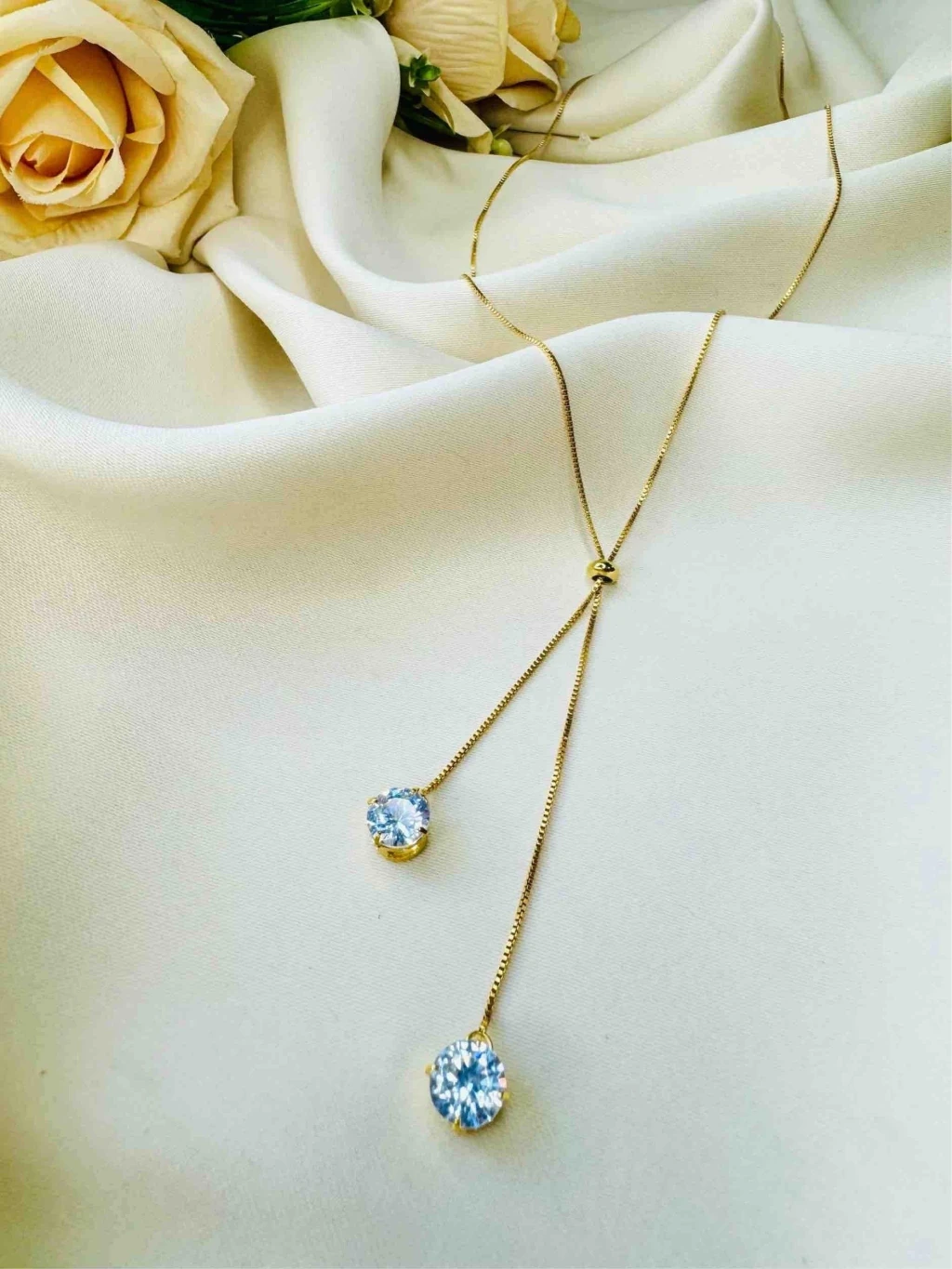 Colar Y duplo em banho dourado, com dois pingentes facetados em azul claro que captam a luz de todos os ângulos. Moderno e elegante, combina com looks casuais ou especiais. Fecho discreto e comprimento ajustável garantem conforto o dia inteiro, deixando o colo realçar com brilho suave e sofisticado.