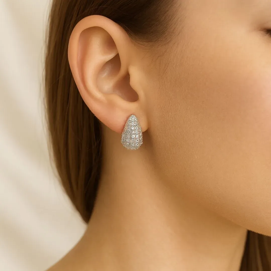 BRINCOS PENDENTES CRAVEJADOS EM BANHO PRATA. Dois pingentes em formato lágrima cravejados com zircônias que refletem a luz, oferecendo brilho intenso e acabamento polido. design elegante, fechamento seguro e conforto para uso diário ou ocasiões especiais. ideal para quem busca um acessório versátil, de qualidade, que eleva qualquer look com um toque de glamour.
