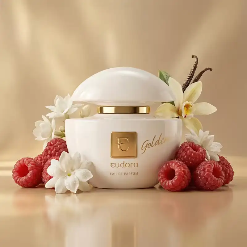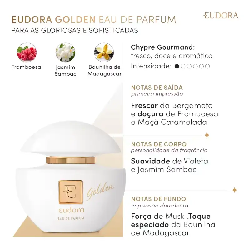 Perfume Eudora Golden – Eau de Parfum com aroma marcante e sofisticado. Fusão de notas quentes e amadeiradas que permanecem na pele ao longo do dia, ideal para ocasiões especiais e para quem busca presença elegante. Frasco branco com detalhes dourados transmite luxo discreto, perfeito para presentear ou complementar looks de estilo.