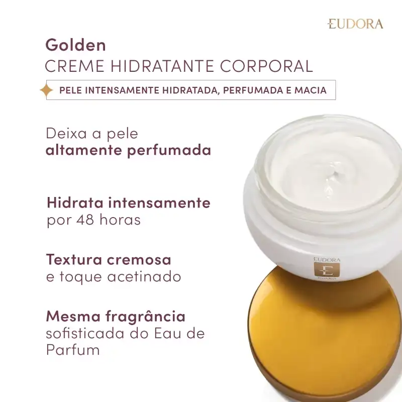 Creme Acetinado Hidratante Desodorante Corporal Eudora Golden — hidratação acetinada com perfume sofisticado.