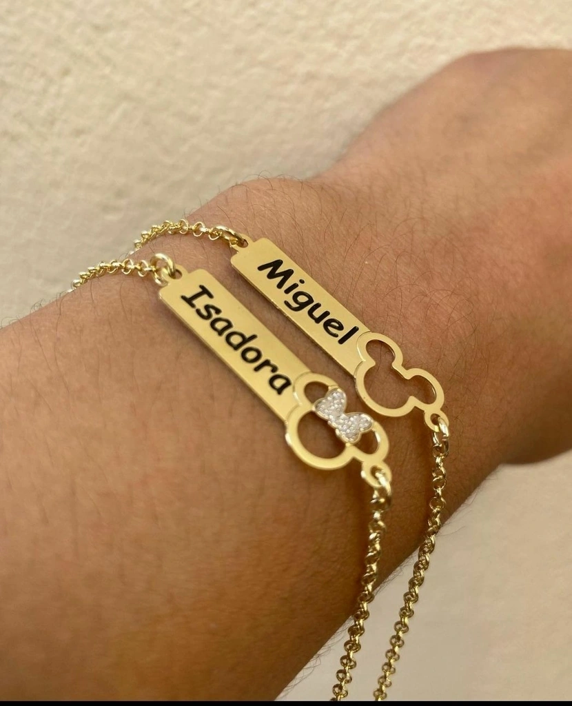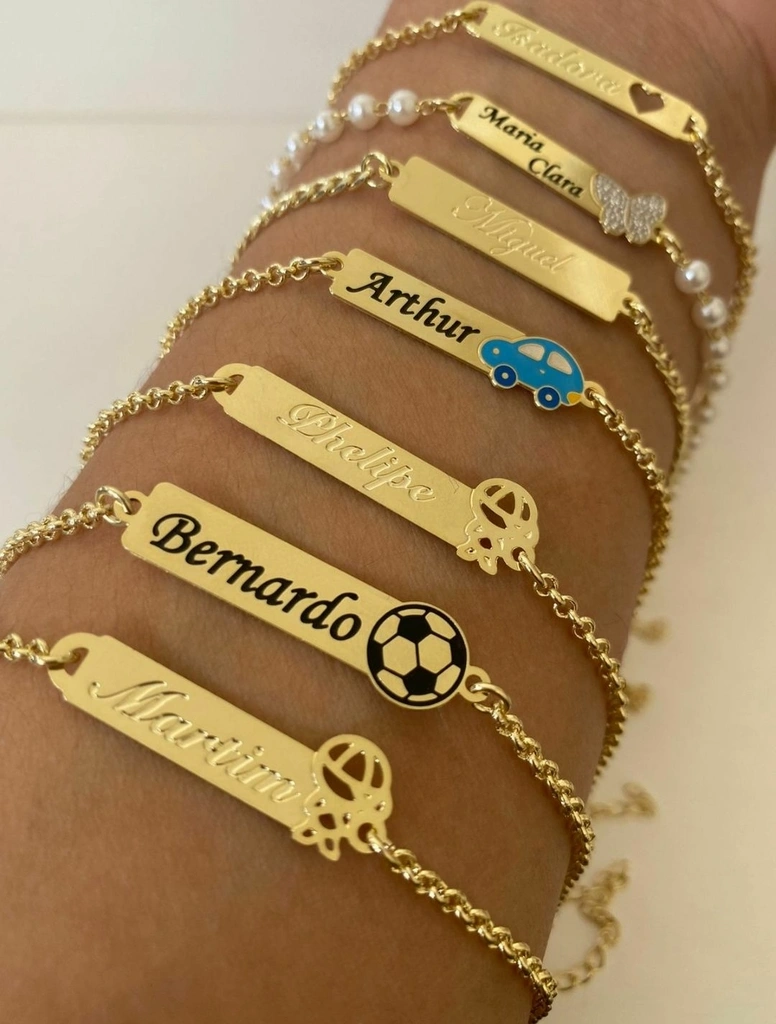 Pulseiras personalizadas com nomes — conjunto elegante de barras gravadas em banho de ouro, perfeito para registrar um nome, uma inicial ou uma mensagem especial. Acabamento polido, elos resistentes e brilho duradouro para o uso diário. Pingentes temáticos (carro, bola de futebol, globo) dão um toque único ao seu estilo. Ideal como presente inesquecível para mãe, amiga ou alguém especial.