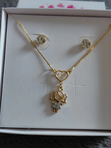 Conjunto Colar Coração e Menina, em acabamento dourado, traz delicadeza para qualquer look. O colar tem corrente fina com pingente em coração e charm de menina, acompanhado de brincos discretos que combinam perfeitamente. Ideal para uso diário, festas ou presentear alguém especial. Fecho seguro, acabamento resistente e brilho suave que valoriza o pescoço sem pesar.